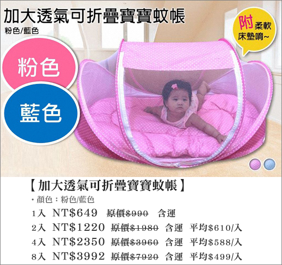 Yale不吝嗇分享他的生活點點滴滴;包括網路上購買的任何東西.Yale是我的好朋友,為人正直又有愛心;Yale他只會推荐好東西!加大透氣可折疊寶寶蚊帳 等好久終於開賣了超讚的啦!加大透氣可折疊寶寶蚊帳該商品熱烈銷售中~ 避免向隅,欲購從速~最近有些網友在問加大透氣可折疊寶寶蚊帳要去哪裡買最便宜呢? |  | 加大透氣可折疊寶寶蚊帳-蚊子大軍來襲!幼嫩孩子岌岌可危,趕緊用專業寶寶蚊帳,免除蚊子近身機會,再送柔軟床墊喔!透氣舒適好好躺平均每入最低只要499元起(含運)即可購得加大透氣可折疊寶寶蚊帳1入/2入/ 售價:499