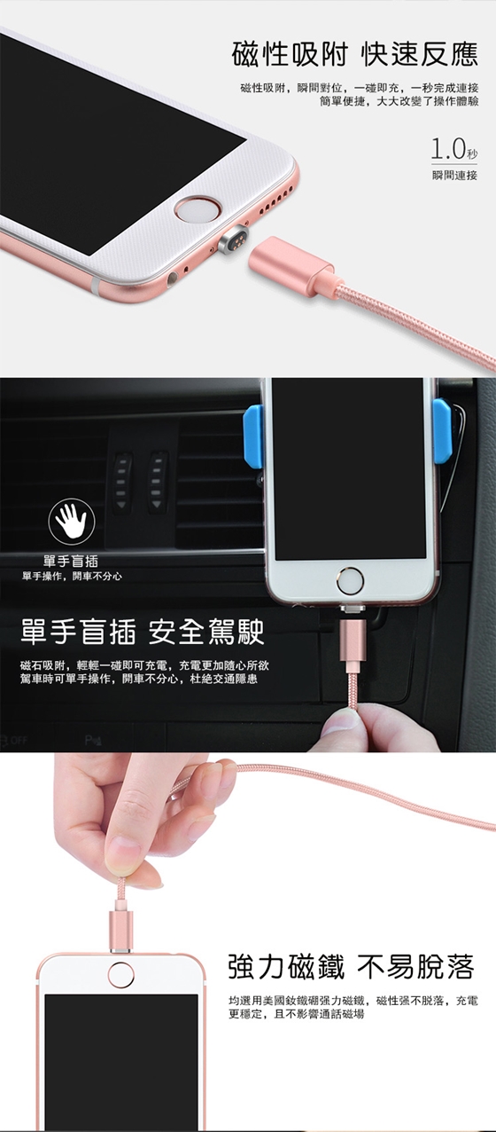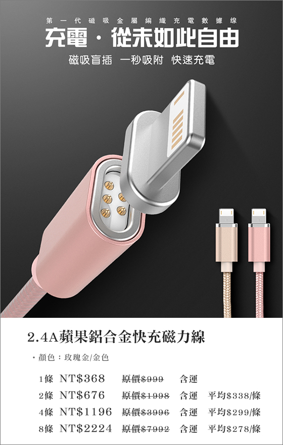 | 2.4A蘋果鋁合金快充磁力線-天天拔插,手機耗損渾然不知!採用革命性概念,磁吸原理不再傷害插孔,保護手機最佳狀態,極致快充工具平均每條最低只要278元起(含運)即可享有2.4A蘋果鋁合金快充磁力線1條 售價:278
